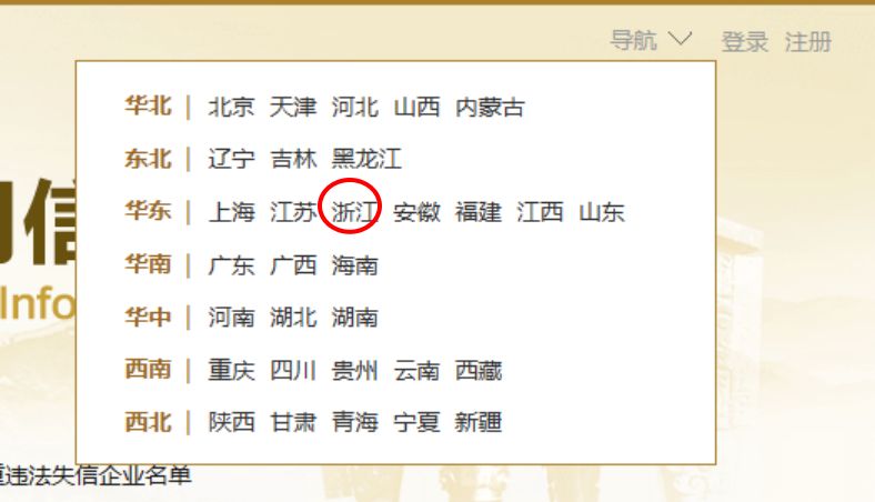 将鼠标移至页面右上角“导航”处,根据企业登记机关所在地选择相应地区。