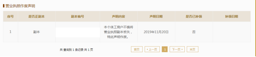下拉页面至显示“营业执照作废声明”一栏后右键打印,携带打印件、身份证复印件一份,经营者本人来窗口办理相关手续