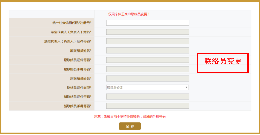 点击红框后根据营业执照信息和实际情况填写保存即可。联络员首选经营者本人。