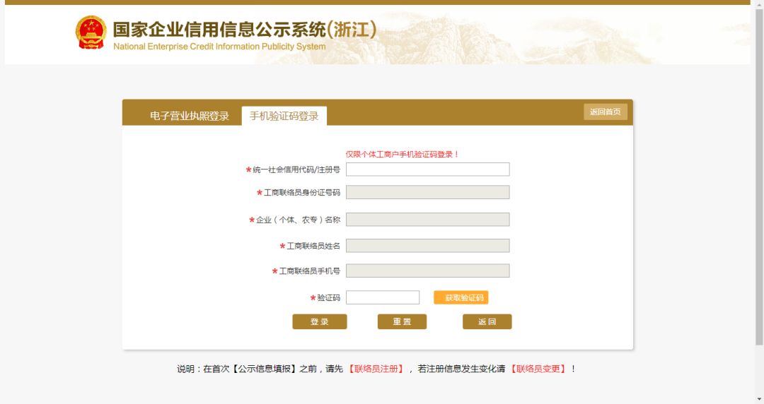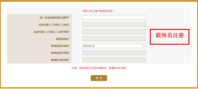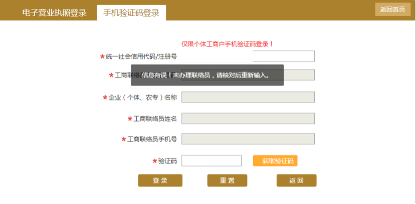 【注意】若经营者是首次登录此系统,或输入“统一社会信用代码/注册号”后出现如下方“信息有误!未办理联络员,请核对后重新输入。”字样,则需在登录前先进行联络员注册。